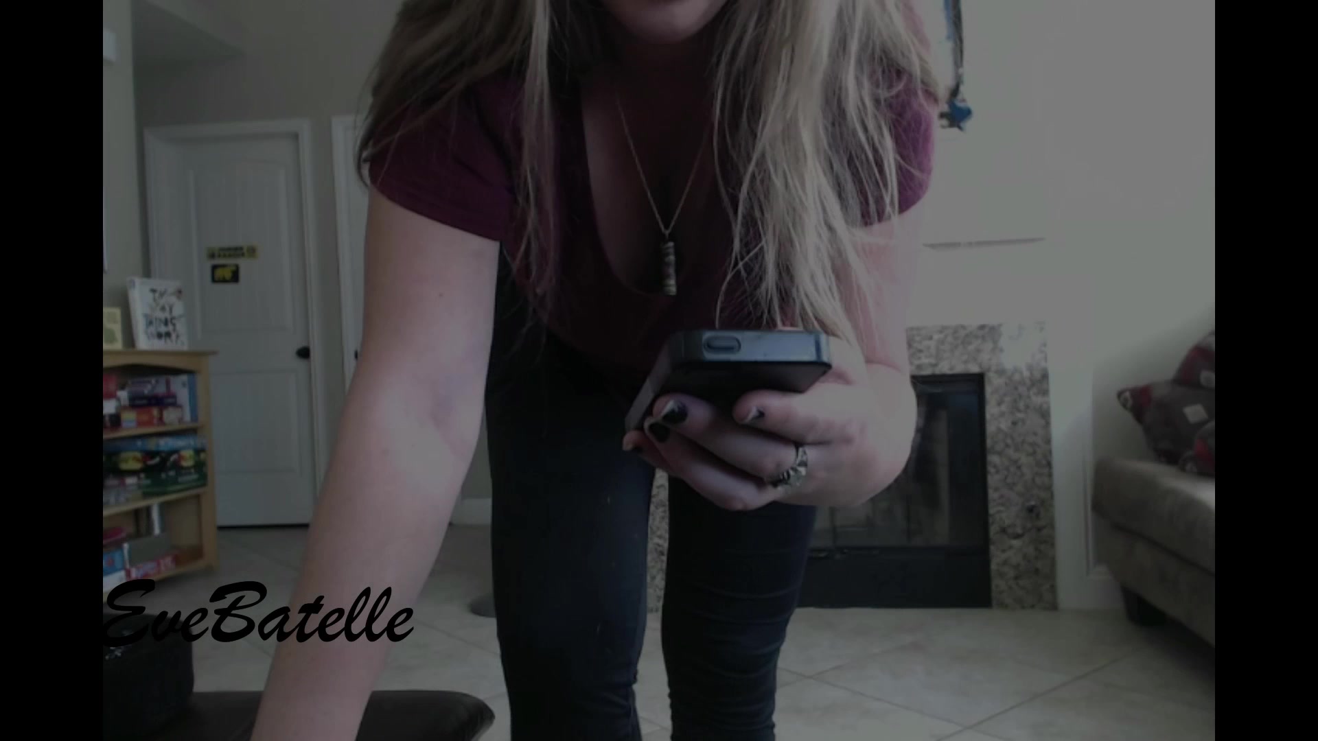 Eve Batelle busty cam girl caresses her lips.